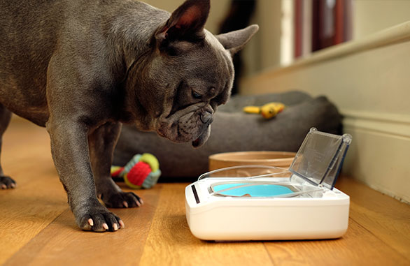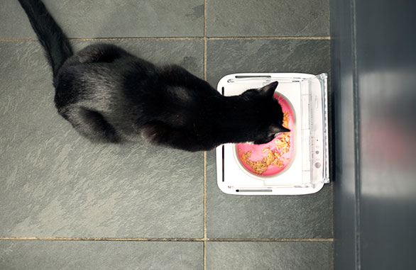 Låget dækker skålen til igen, når kæledyret går væk Skålen er dækket helt frem til næste gang, kæledyret nærmer sig